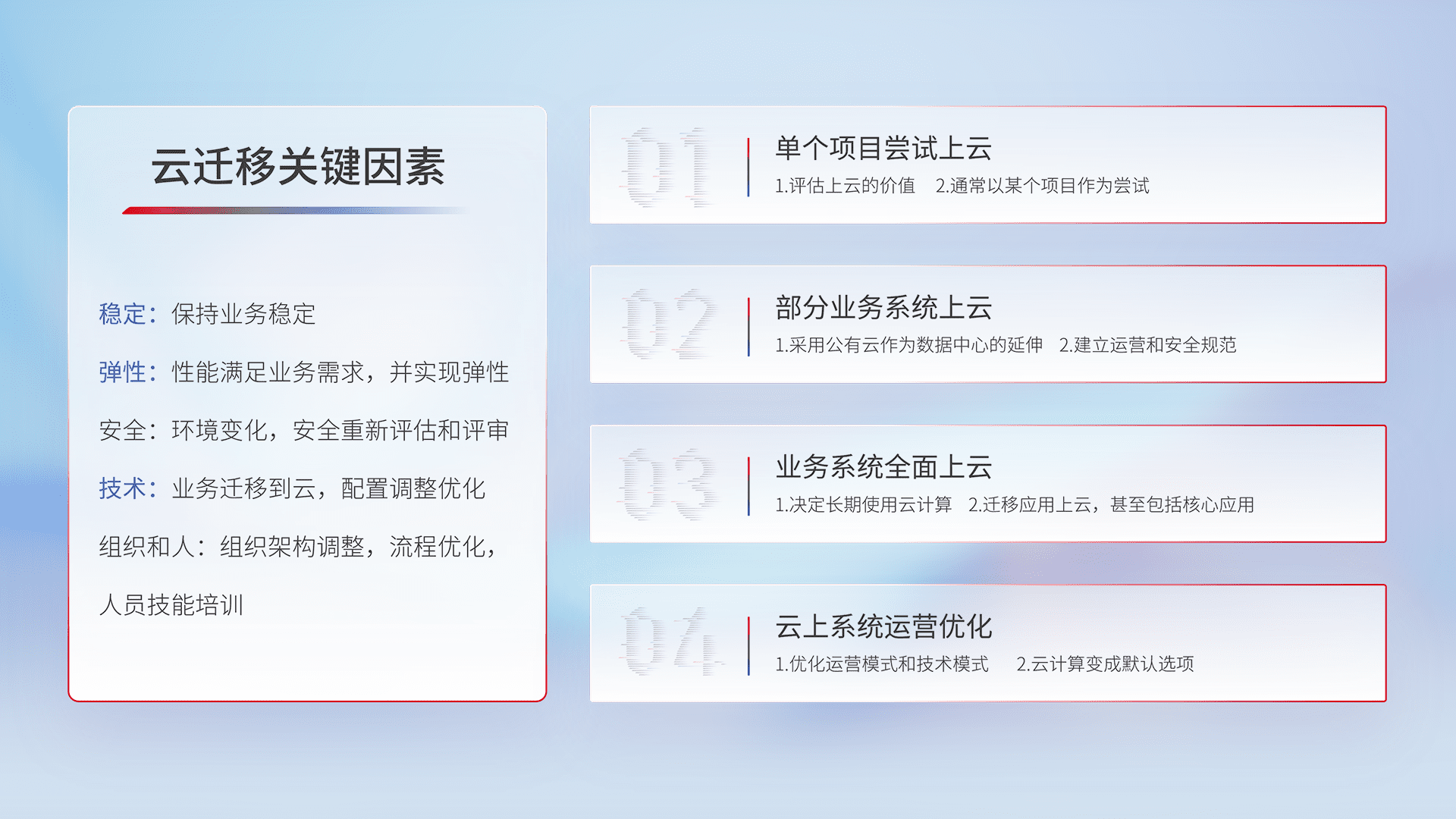 结合实际业务,,从规划设计、、、云平台选型、、、、云原生改造、、、数据迁移、、、、集成交付,,,,迁移全过程为客户识别最佳上云路径,,,,做好风险识别管理,,设计网络架构、、、身份权限、、、安全审计合规、、、、操作审计、、日志审计、、、监控告警策略、、多站点容灾设计等,,,,对云上基础设施进行整体规划,,提升IT治理水平,,,以满足弹性、、、、高可用、、、、高性能的需求。。。。