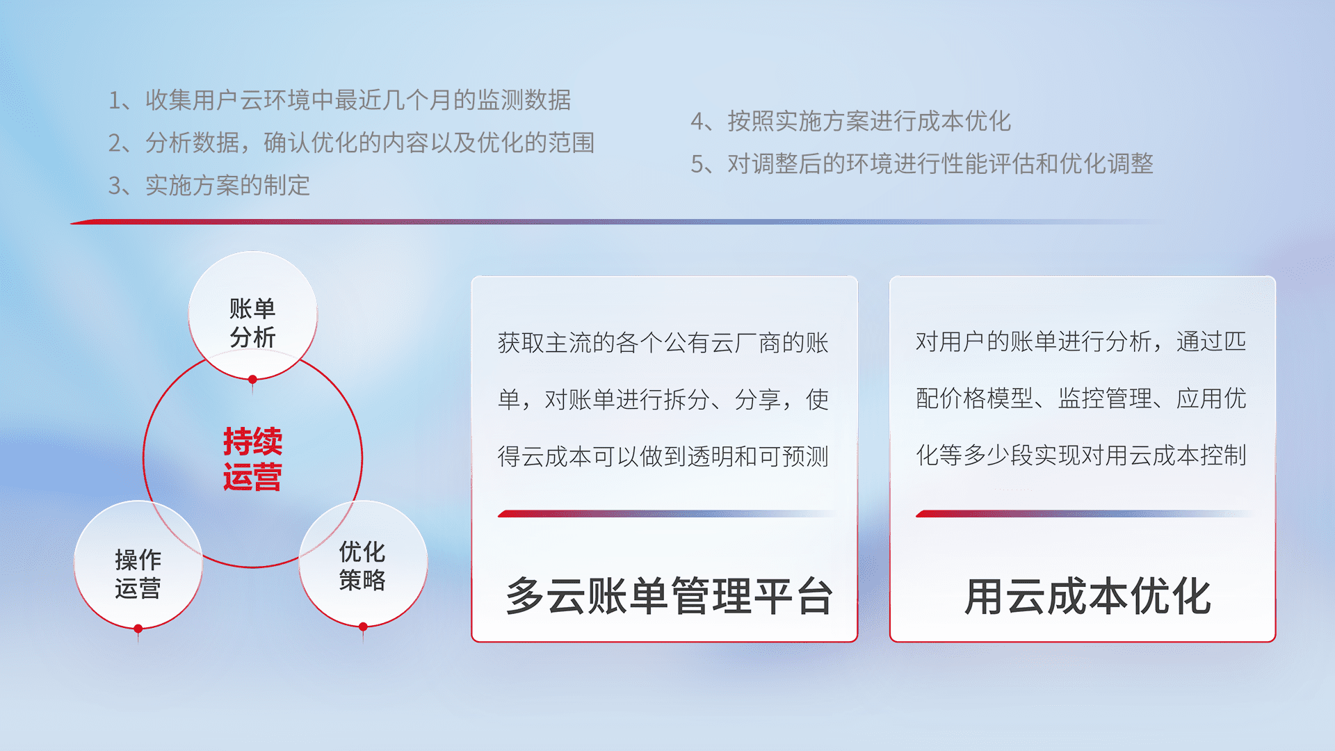 通过多云纳管,,,,以统一的资源数据模型把客户的云资源进行抽象和封装,,,进而实现对多云资源的统一操作,,,保障云资源管理的可靠性、、、稳定性与可用性。。。量身定制化运维内容,,配置、、、开发运维、、、、补丁管理、、、、备份、、、监控、、、认证和访问管理、、审计和日常巡检等,,,保障在用云过程中的可靠度,,,,稳定度以及高可用率。。。。