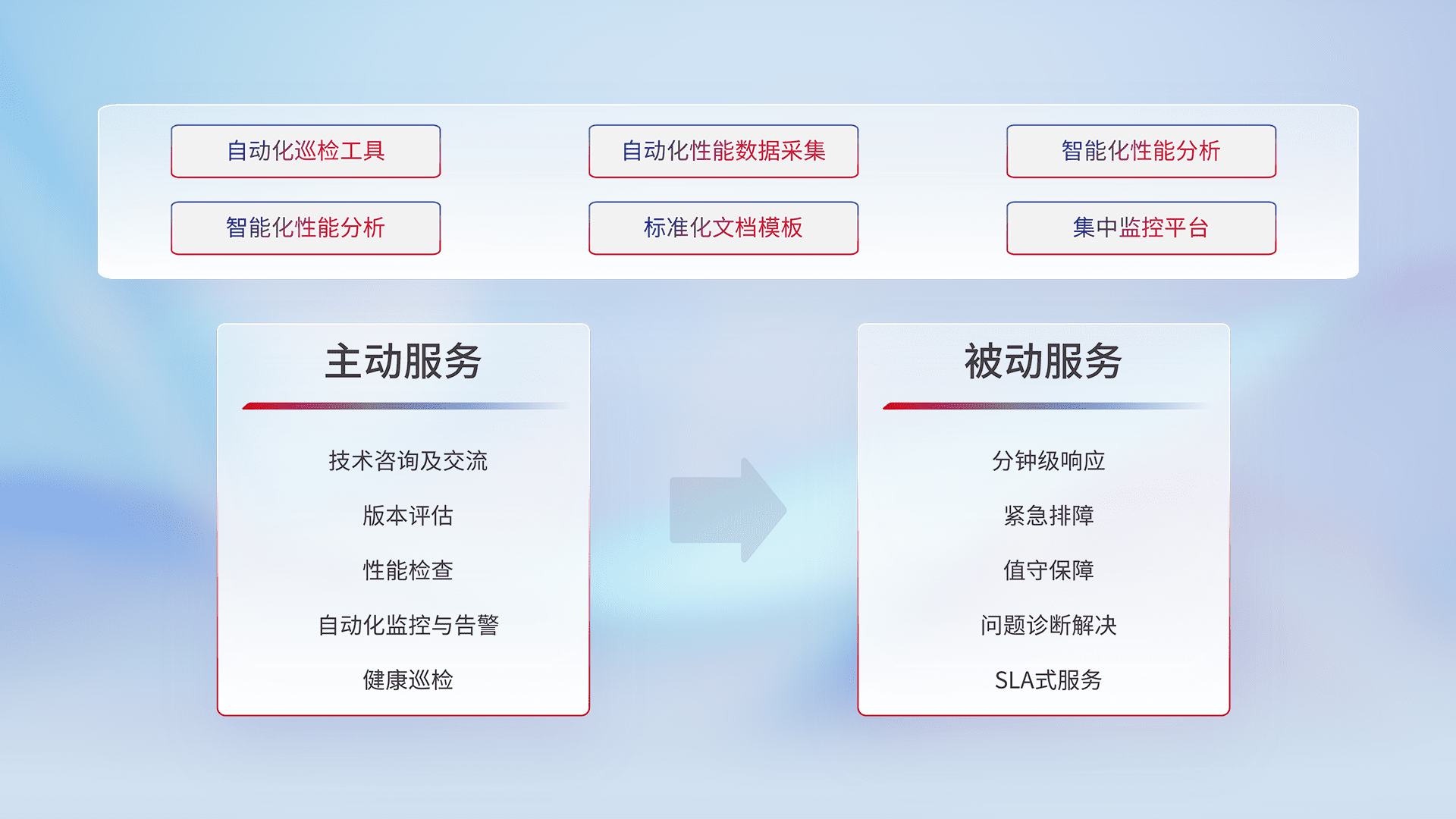 智能化工具和标准化文档,,,保障服务质量,,,,提供主动服务(包含技术咨询、、、版本评估、、、、性能检查、、自动化监控与告警、、、健康巡检)和被动服务包含(分钟级响应、、紧急排障、、、、值守保障、、问题诊断解决、、SLA服务)。。。。